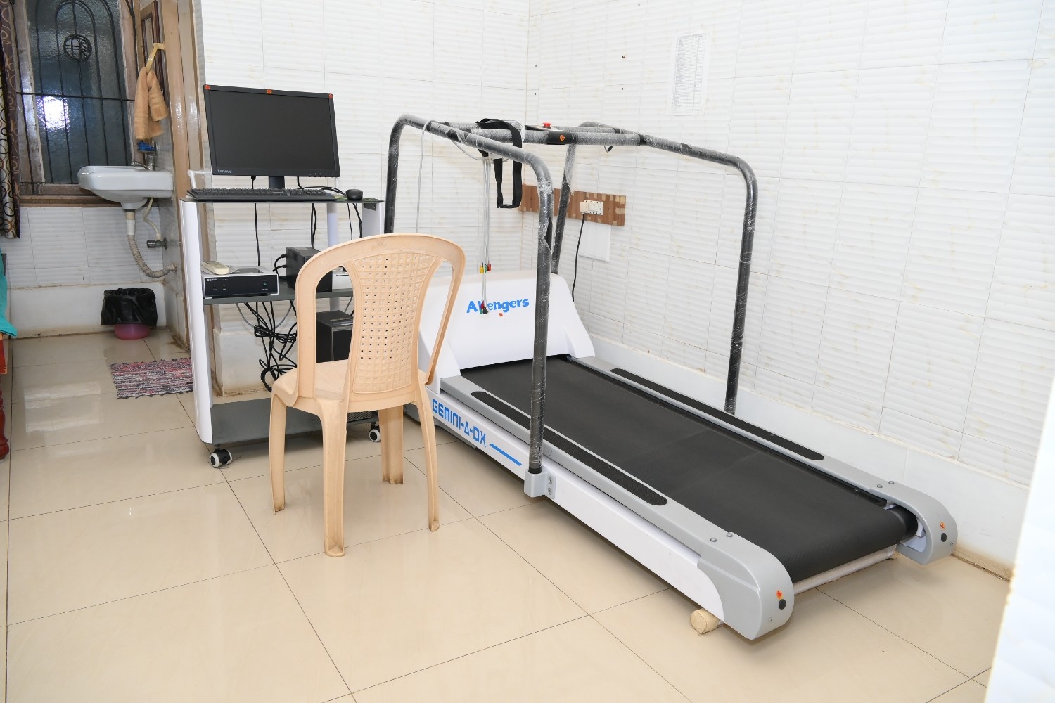Treadmill testing facility for cardiac stress evaluation. Used for diagnosing heart conditions and assessing exercise tolerance of patients.